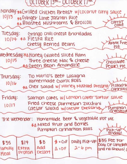 From Monday to Friday, we provide family meals with a fresh menu that changes each week. We handle all the cooking; all you need to do is pick up, reheat, and enjoy!