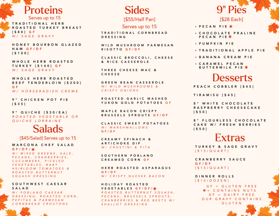 At Marcona Kitchen, we value the connections of family and friends, which has motivated us to create a delightful Thanksgiving Menu. Select the options that best meet your Thanksgiving dinner requirements, and we'll handle the rest for you.